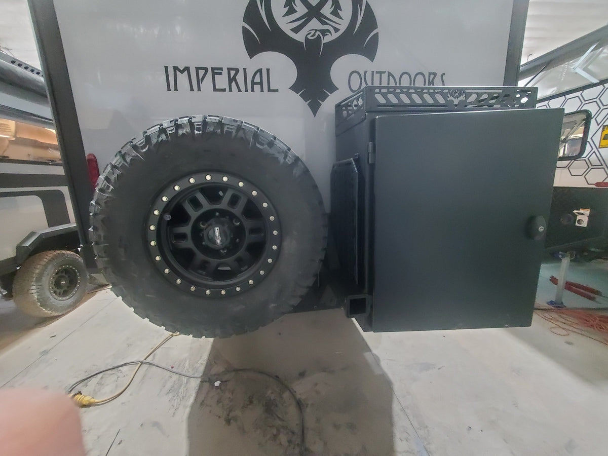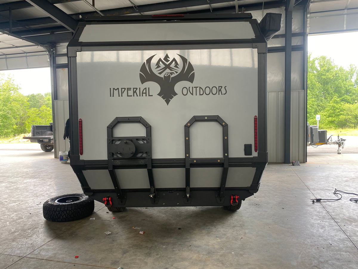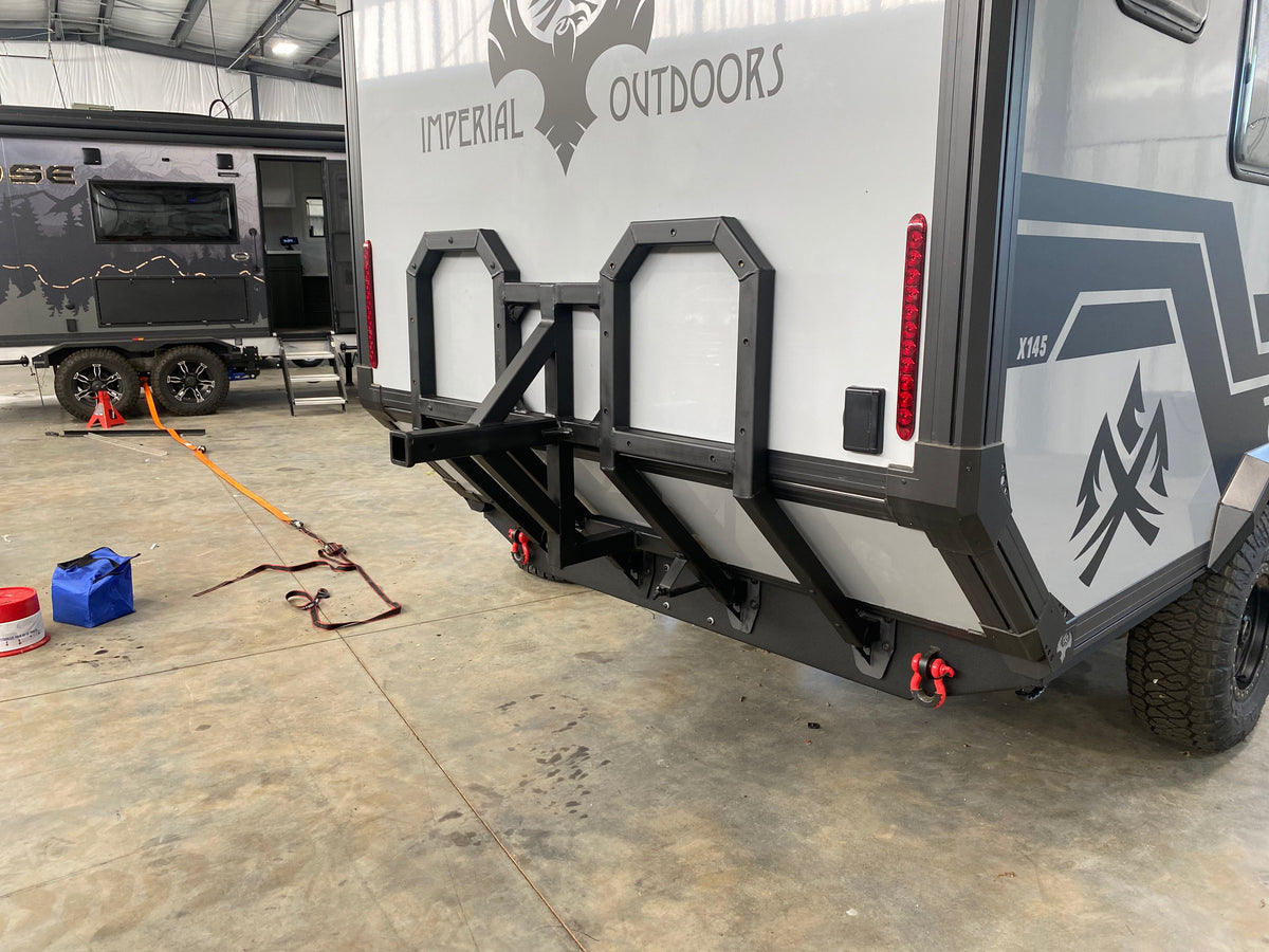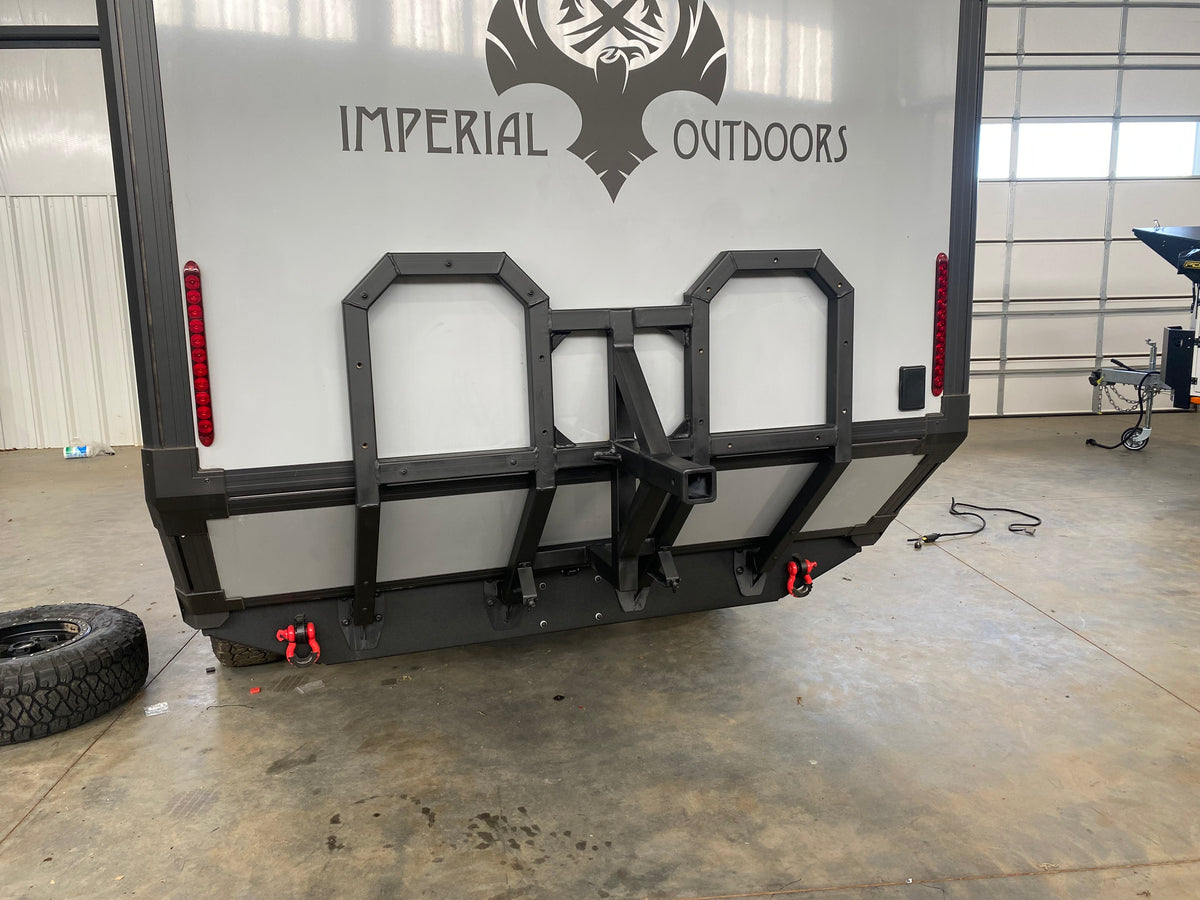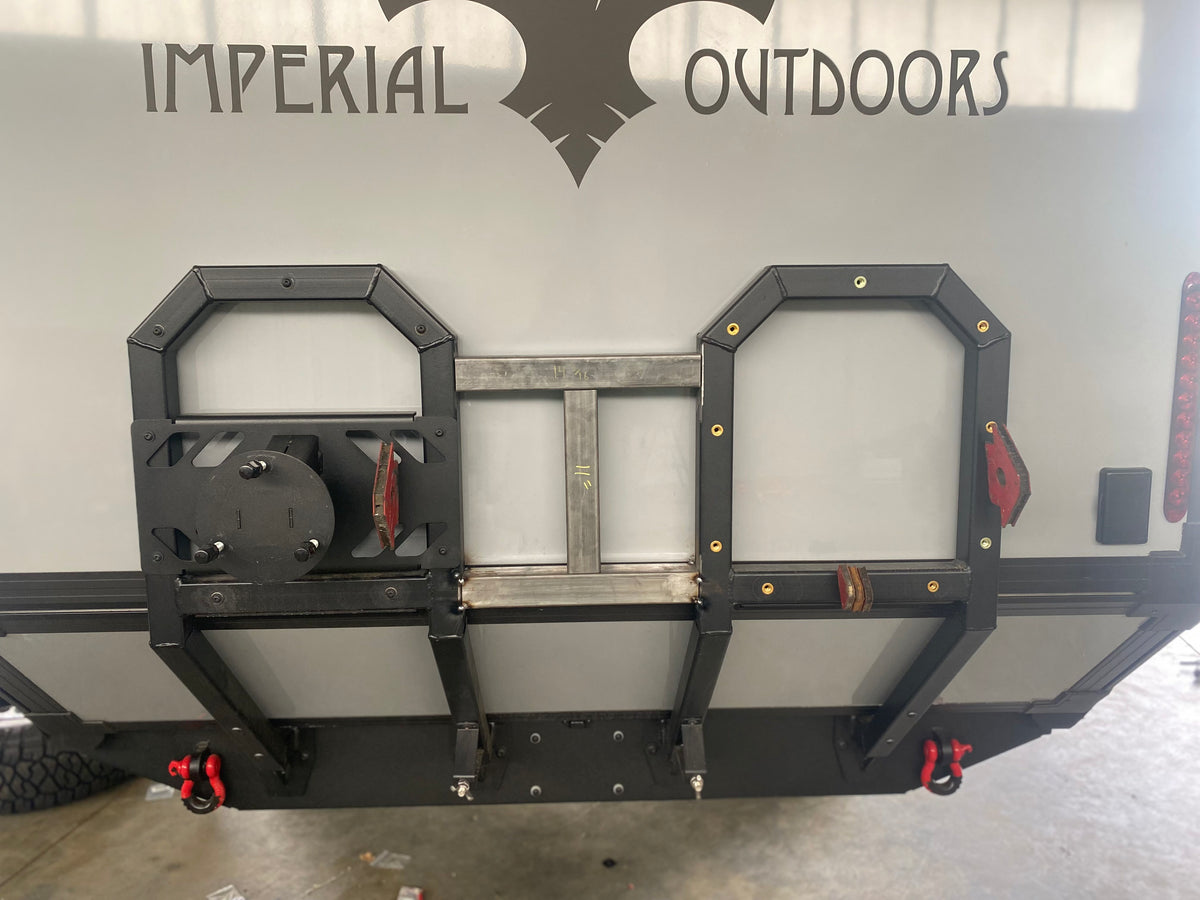 Custom hitch mount modification designed to add bike rack capability while maintaining clearance for spare tires and rear storage on travel trailers. Built for strength, alignment, and corrosion resistance to ensure long term reliability. The unit shown features this upgrade on an Imperial Outdoors X195.